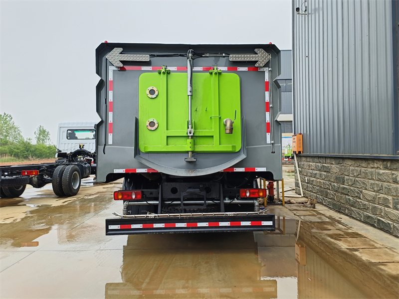 洗掃車,道路清掃車前端加有可左右上下擺動的高壓沖嘴,可對局部頑漬進行沖洗。開式液壓系統驅動左右立掃升降、左右掃肋旋轉、吸嘴升降、垃圾箱后門開閉、垃圾箱傾翻復位等機械動作。底盤變速箱側取力器驅動低壓水泵,實現灑水車的低壓沖洗功能。工作裝置電控系統采用PLC智能化控制,一鍵式作業起動和停機,操作方便,大大減少誤操作。