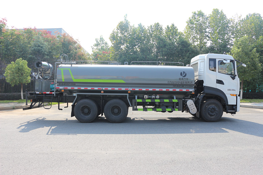 灑水車上裝配置:罐體采用5mm厚武鋼集團供應的罐車專用板材制作,容積:20立方;罐內3道防浪隔板具有防波作用,減低罐內液體的沖擊。配備國內大功率灑水車專用水泵,可自吸自排,引水時間<15min,流量60m3/h,揚程90米。東風天龍灑水車其它專用部分標配為:前沖、后灑、側噴、后工作平臺、360度可調節綠化水炮,水泵垂直吸程≧7米,前沖灑水寬度≧16米,綠化水炮射程≧35米,自流閥、濾網、消防接口(可連接消防栓取水,可作應急消防用)。罐前量管(觀察罐內水位)、罐后爬梯、罐上罐口帶簡易護欄、罐側雙炮筒、6米長4寸鋼絲塑膠管兩根,罐體表面雙層油漆工藝,防銹、耐腐蝕,其余有廠家標配。可選擇加裝加裝藥盤、氣動控制閥、噴藥設備、罐內防腐等。