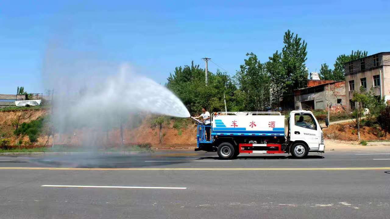 改裝配置:罐體用4MM碳鋼板制作,罐內隔板具有防波作用,以減低汽車行駛時罐體液體的沖擊。整車帶一個專用灑水泵(垂直最大吸程6米),灑水寬度14米,射程28米。多功能灑水車配備2個前沖(噴)(能將路面泥巴、塵土、垃圾沖干凈);2個后灑(能均勻地將水灑在路面,一次灑水寬度14米)、2個側噴(花灑)(能均勻地將路旁綠化帶澆灌)、帶1個后工作平臺,平臺上安裝1個綠化灑水高炮(灑水炮可全方位旋轉,可連續調成直沖狀、大雨、小雨、毛毛雨,霧狀可調節沖洗高大樹木),引水時間<5min,流量90m3/h。帶1個消防接頭,帶1個自流閥,1個過濾裝置、人性化爬梯及側防護欄,安裝灑水音樂喇叭。