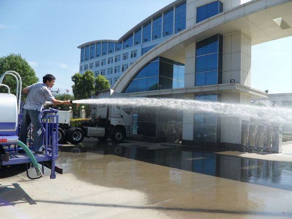 灑水車前裝有鴨形噴嘴或圓頭沖嘴,后面裝有圓柱開灑水噴嘴或蓮蓬頭噴嘴,后部有一工作平臺,裝配有水炮。后部還可裝8個噴嘴(選裝)。