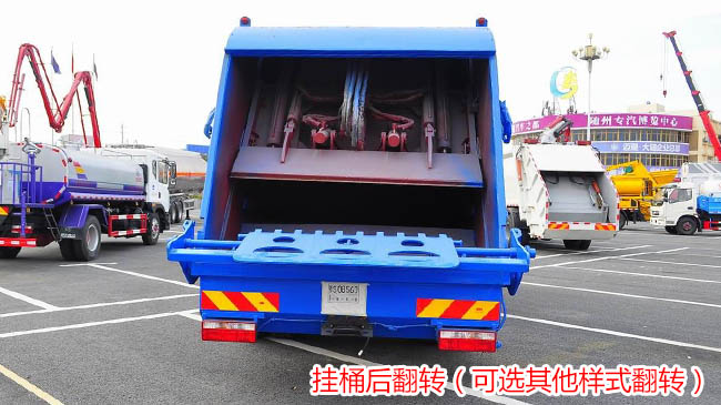 3、壓縮式垃圾車帶掛桶提升架,可配套使用全國通用鐵制掛桶或塑料掛桶、強力裝填,把垃圾擠入車廂并壓實和推卸。