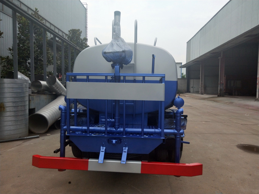 該灑水車具有前沖后灑、側(cè)噴(更換噴頭后變?yōu)閭?cè)花灑)、后置式工作平臺(帶踏梯,四周有安全護(hù)欄)、平臺上設(shè)置有高壓水炮(可360°旋轉(zhuǎn),可調(diào)成柱狀射程28米,也可調(diào)成霧狀射程14米,可調(diào)成:直沖狀、大雨、中雨、小雨、毛毛雨),整車灑水寬度大于14米.配備優(yōu)質(zhì)大功率專用灑水泵,取力器,雜物過濾網(wǎng),國標(biāo)通用65型消防接口(可通過消防栓加水)、1套自流球閥系統(tǒng)(可自吸自排,吸程6米),2根引水鋼絲膠管(帶陰陽快速接頭),配鎖,水位計,作業(yè)高音喇叭.兩側(cè)及后加強(qiáng)型保險杠,防滑爬梯,膠管儲存筒.
