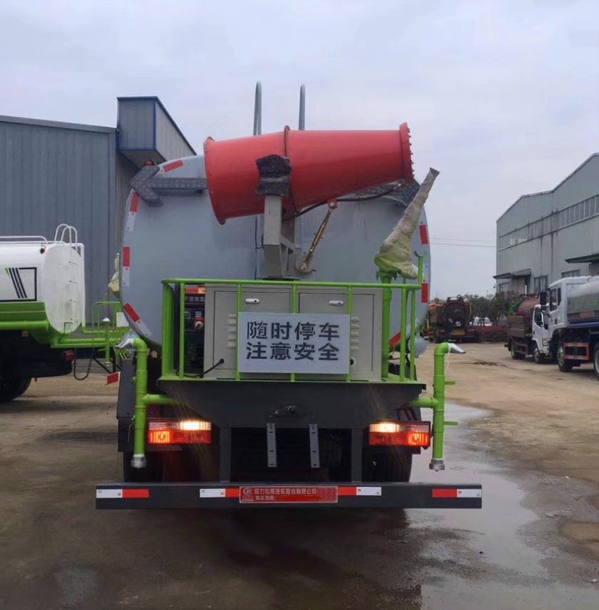 上裝配置標配:前沖,后灑,帶側噴(備注:側噴可連接蓮蓬頭噴頭和鴨嘴噴頭);后帶工作平臺,平臺上安裝綠化灑水車高炮,高炮可以360度旋轉,炮噴灑形狀可調節;帶自流閥及消防接頭各一個,60-90程力牌灑水車專用水泵