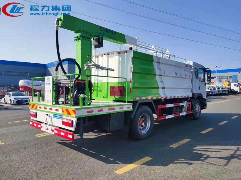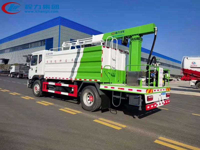 上裝配置:罐體為11 立方形罐,罐體內部做防腐,抑塵噴灑桿(帶旋轉伸縮功能)。具有前沖、后灑、高炮功能,罐體及管道做保溫處理,噴灑桿離地3.5-4.5 米,億豐水泵,后部平臺帶8KW 副發電機組,罐體內部加兩個1.5KW 電機(帶攪拌功能)罐體噴漆上白下藍,平臺和噴灑桿綠色。遙控操作噴灑桿上下左右旋轉,平臺較上一臺車左右加寬20CM,電控箱安裝在后部平臺。