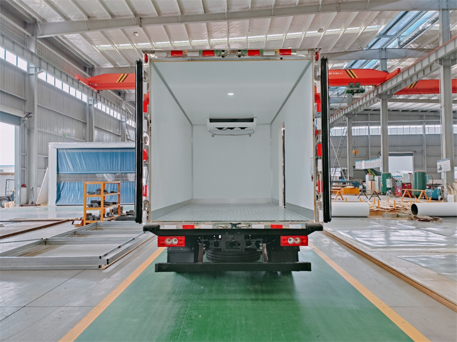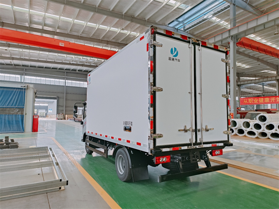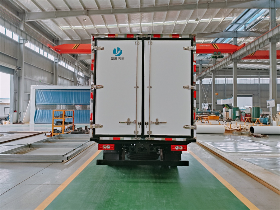 廂體采用內(nèi)外玻璃鋼材料制作,中間夾層為高密度保溫材料,用真空復(fù)合一次成型,表面光潔平整,強(qiáng)度高,使用壽命長(zhǎng),廂體邊緣采用優(yōu)質(zhì)鋁合金包邊和專用密封膠處理,具有重量輕、保溫、密封效果好等特點(diǎn)。門框鎖件為不銹鋼材質(zhì),門四周用一次成型密封條密封,廂體外形平整美觀,車廂頂部加以雨檐,避免下雨天雨水對(duì)車廂的浸泡,延長(zhǎng)廂體使用壽命,車廂內(nèi)配有人性化照明系統(tǒng)。穩(wěn)固性和氣密性是普通冷藏車廂體不可比的,并且具有質(zhì)量輕,抗沖擊力強(qiáng),無(wú)滲透等優(yōu)點(diǎn)。配備國(guó)產(chǎn)580制冷機(jī)組。